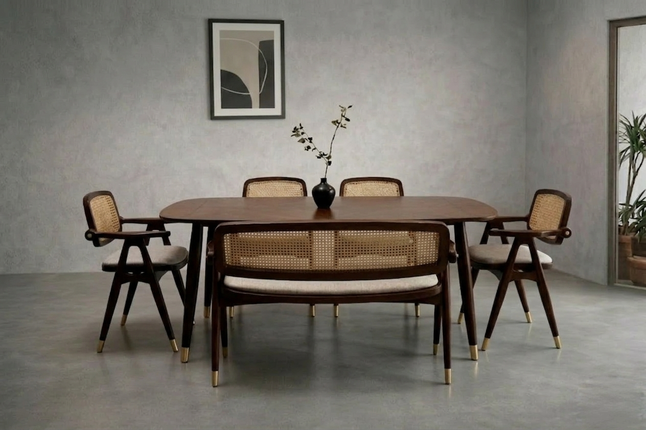 The Aranya Mid-Century Dining Table is an invitation to slow down and savor the art of gathering. Inspired by the fluidity of organic forms, this piece features a meticulously polished Acacia top that celebrates the wood’s natural character. Supported by slender, tapered legs finished with brushed brass ferrules, it balances vintage charm with a crisp, luxury aesthetic—perfect for the refined interior.