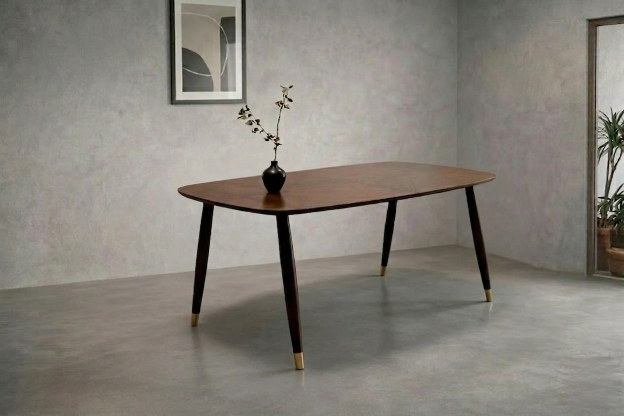 A masterclass in Mid-Century elegance, the Aranya Dining Table pairs the rich, swirling grains of solid Acacia wood with sophisticated brass-tipped legs. Its softened elliptical edges and architectural silhouette bring a sense of “Contemporary Heritage” to the modern home.