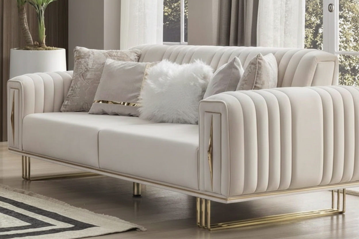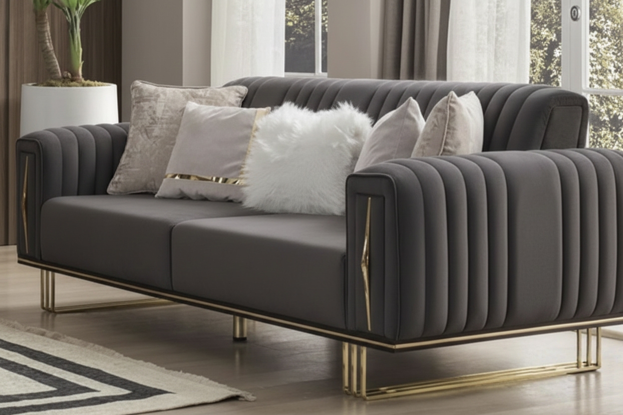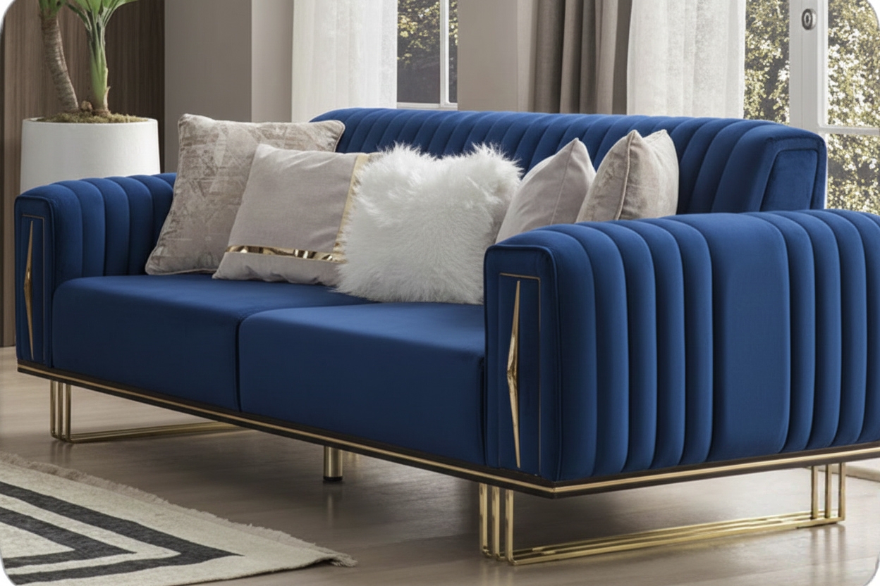 The Aurelius Gold-Trim Sofa combines sculpted channel tufting, plush velvet upholstery, and a sleek gold-accented base to create a statement piece that elevates modern luxury interiors.