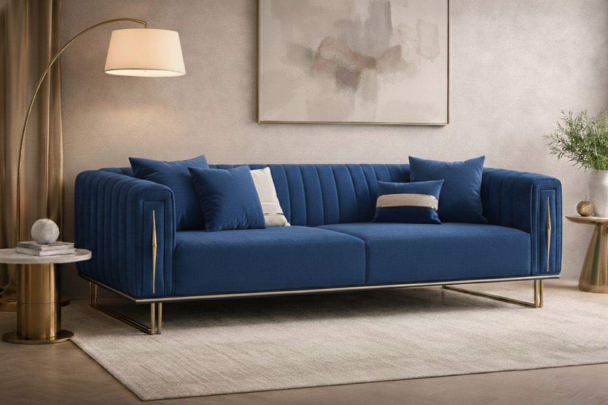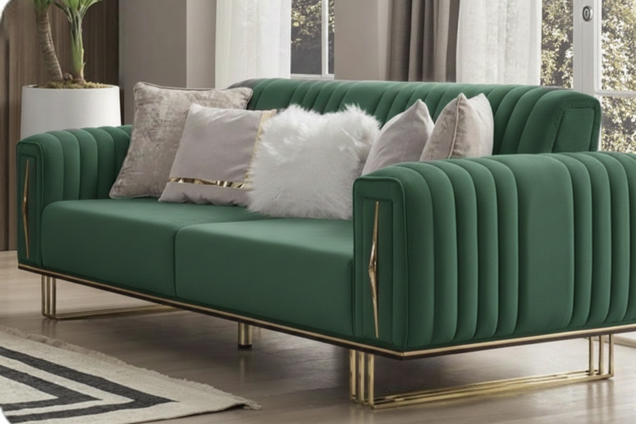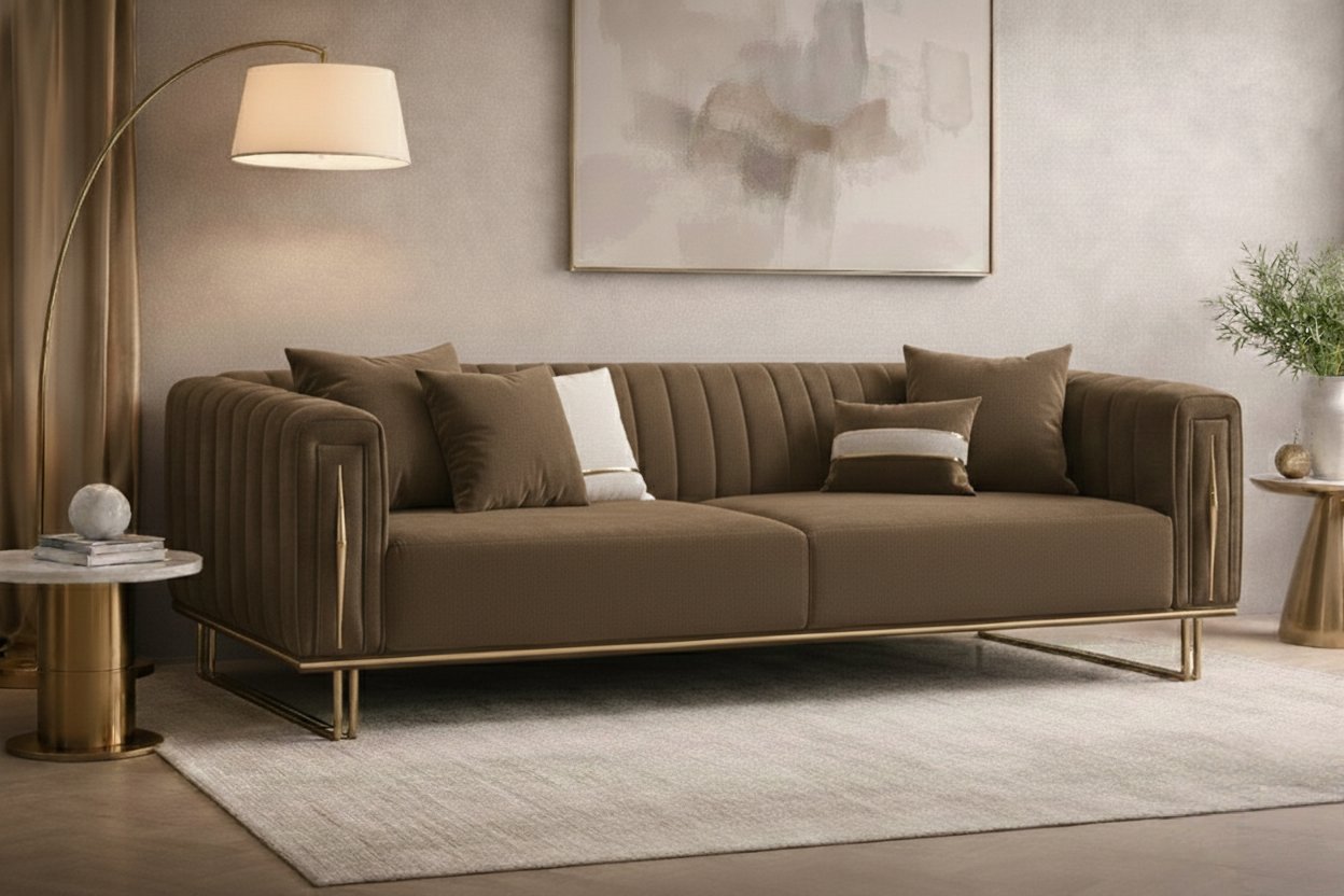 Crafted for elegance and comfort, the Aurelius Gold-Trim Sofa is a modern luxury masterpiece. Its vertical channel tufting, structured silhouette, and rich velvet upholstery create a sculptural presence in any living space. The solid wood frame ensures durability, while the stainless-steel gold-finish base and trim add a glamorous touch. Perfect for upscale homes, boutique hotels, and premium lounge areas, this 3-seater sofa delivers style and comfort in equal measure.
