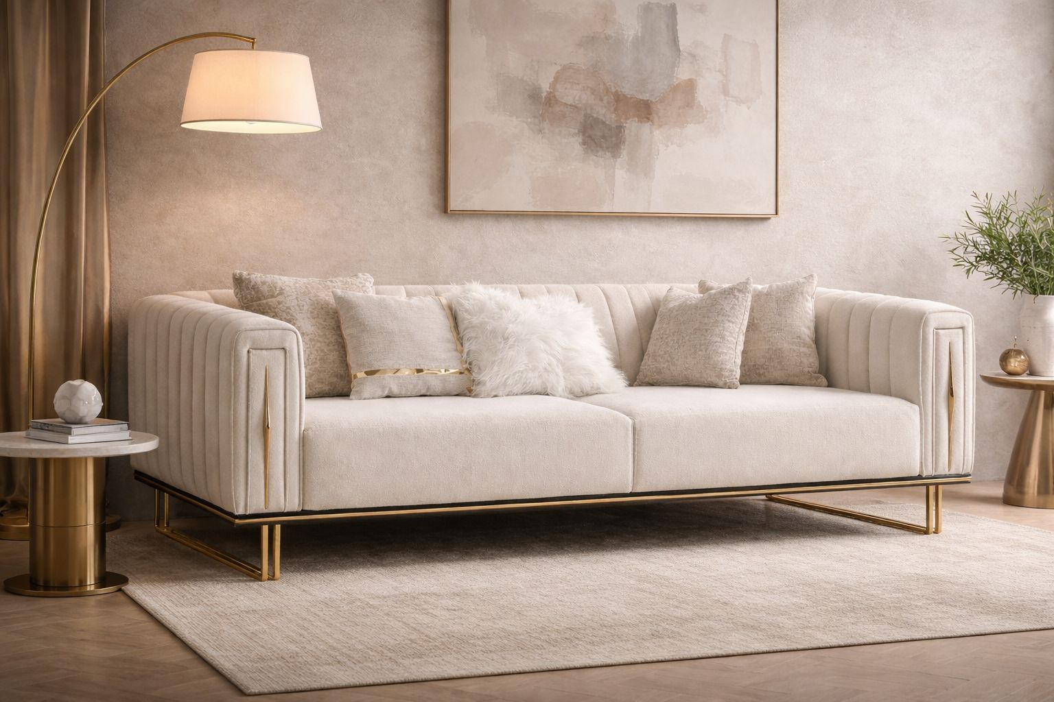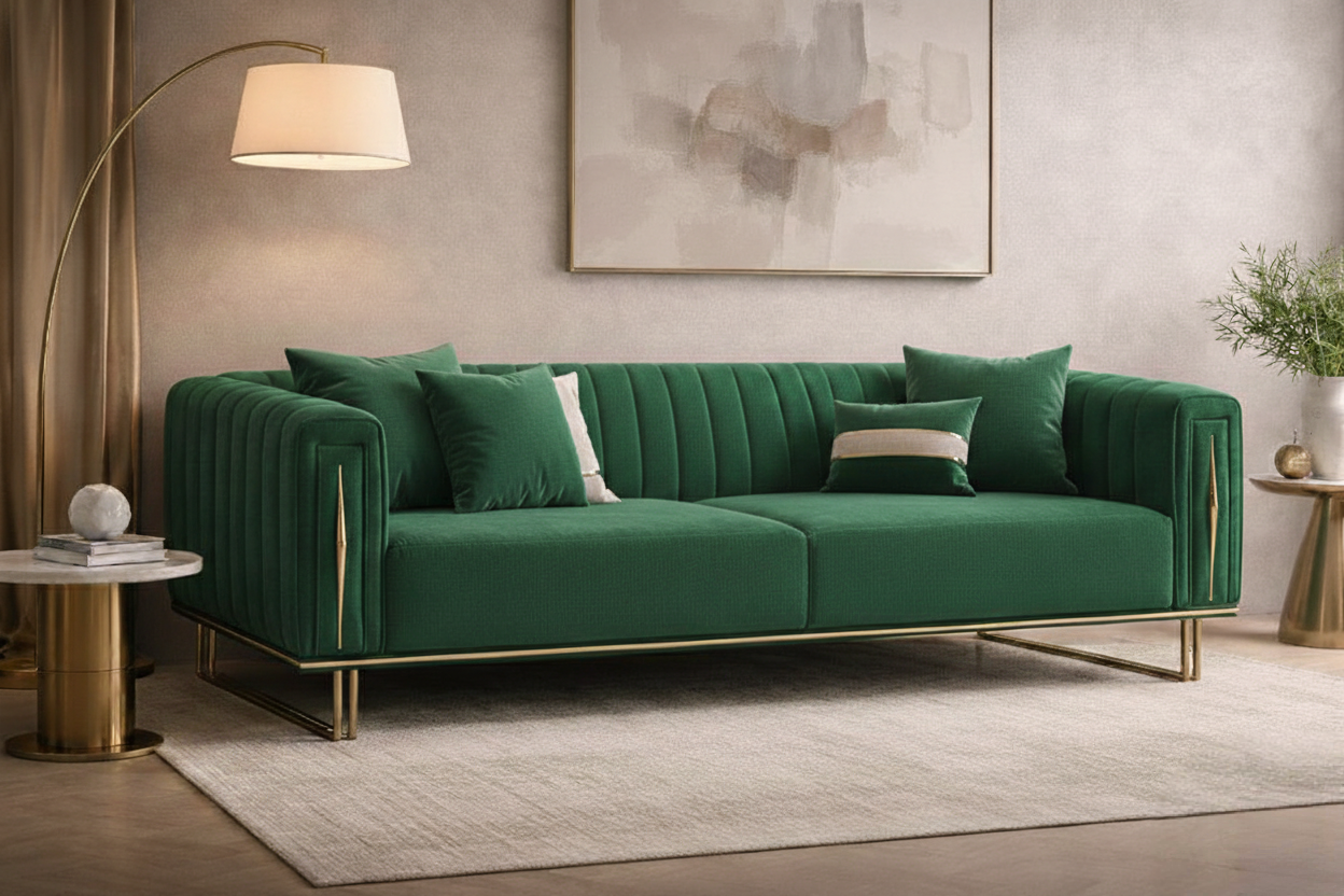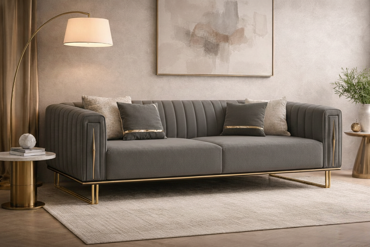 Crafted for elegance and comfort, the Aurelius Gold-Trim Sofa is a modern luxury masterpiece. Its vertical channel tufting, structured silhouette, and rich velvet upholstery create a sculptural presence in any living space. The solid wood frame ensures durability, while the stainless-steel gold-finish base and trim add a glamorous touch. Perfect for upscale homes, boutique hotels, and premium lounge areas, this 3-seater sofa delivers style and comfort in equal measure.