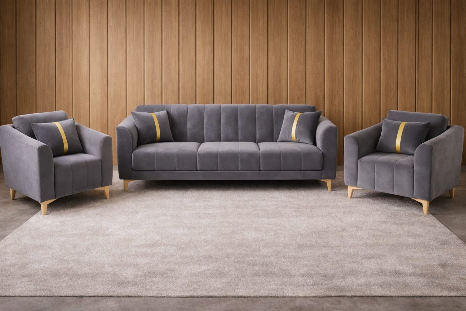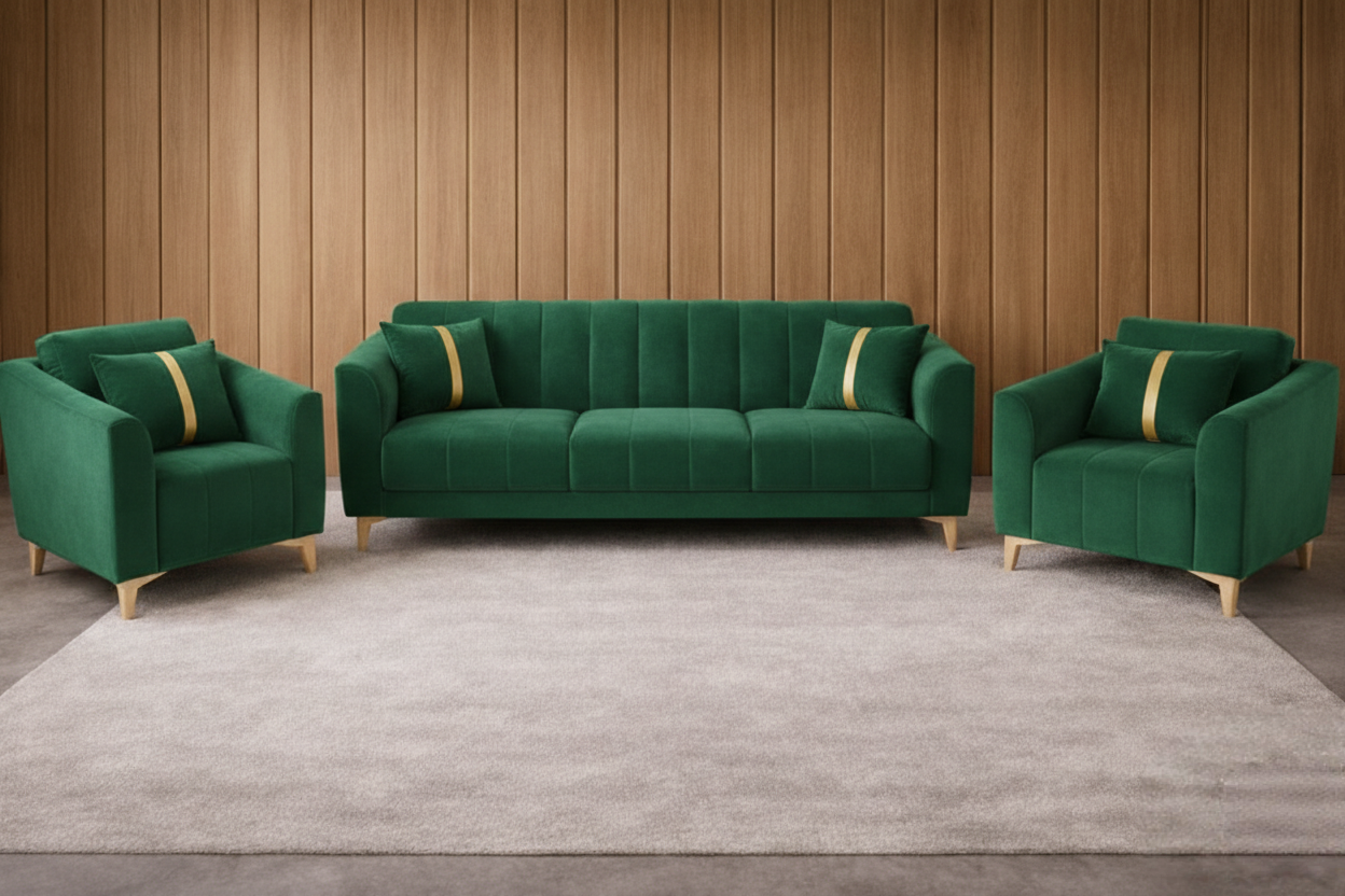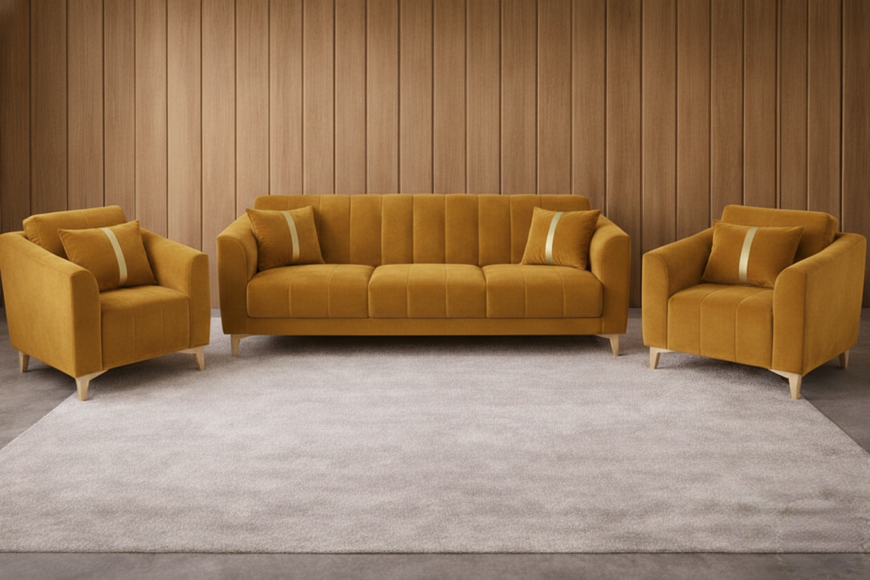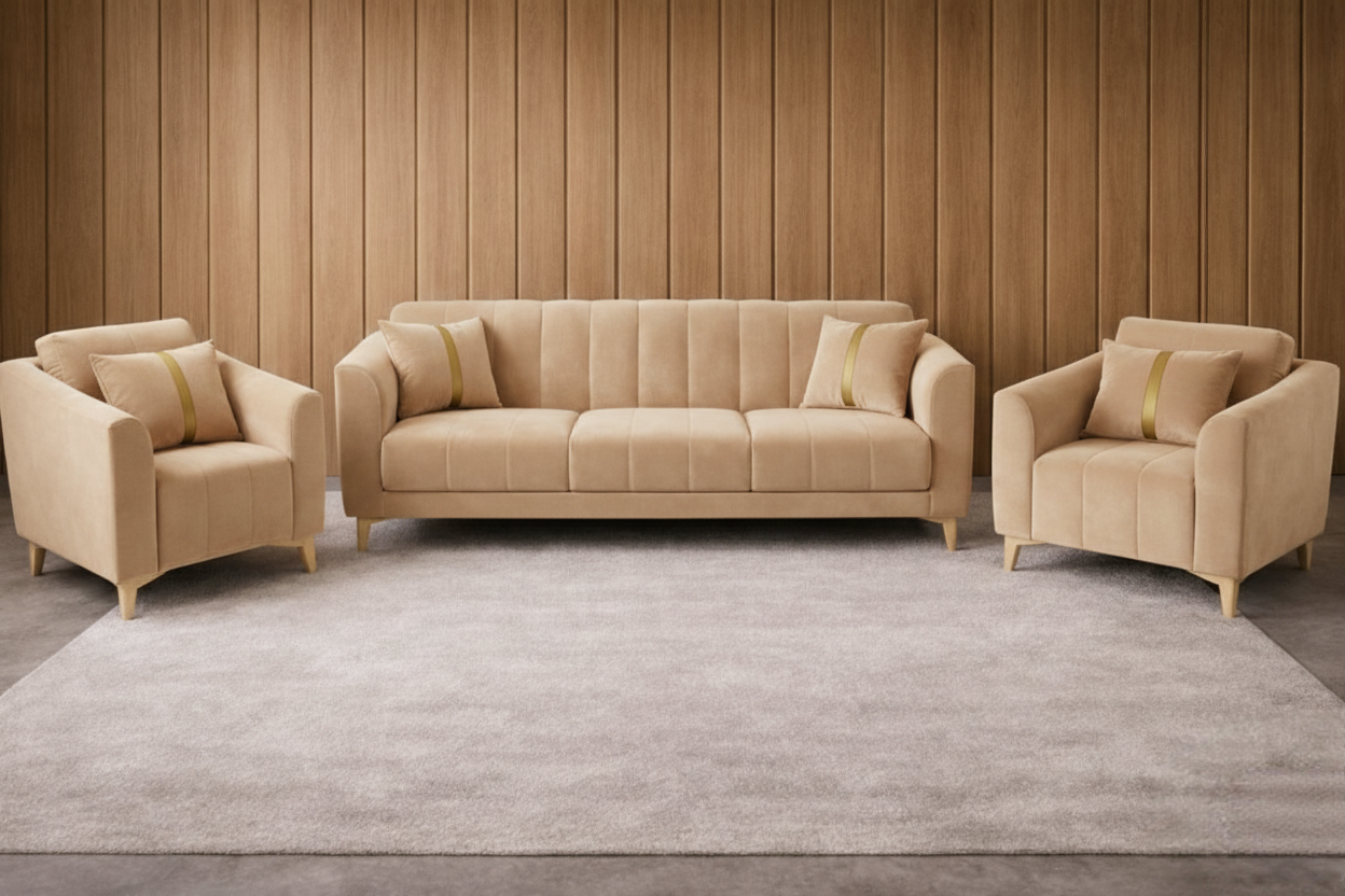The Sorrin Luxe Living Room Sofa Set translates minimalist sculptural lines into a welcoming silhouette. Designed for modern interiors, its soft contoured back and deep, plush seat cushions create a calm, collected lounge experience. Each piece is handcrafted by skilled artisans in Trivandrum using a hardwood frame and premium upholstery, marrying durability with a tailored finish that ages beautifully.