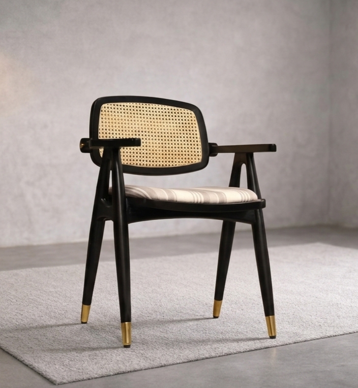 A masterful blend of mid-century silhouette and contemporary heritage. The Vesper Cane Armchair features hand-woven rattan set against a deep Charcoal Noir acacia frame, finished with signature brass-tipped legs for a touch of modern luxury.